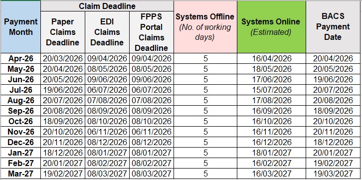 * Please note – The deadlines for EDI and FPPS claims are provisional dates only. These dates can and will fluctuate depending on business need, therefore the BSO direct that all EDI and FPPS claims should be submitted on a daily basis.
